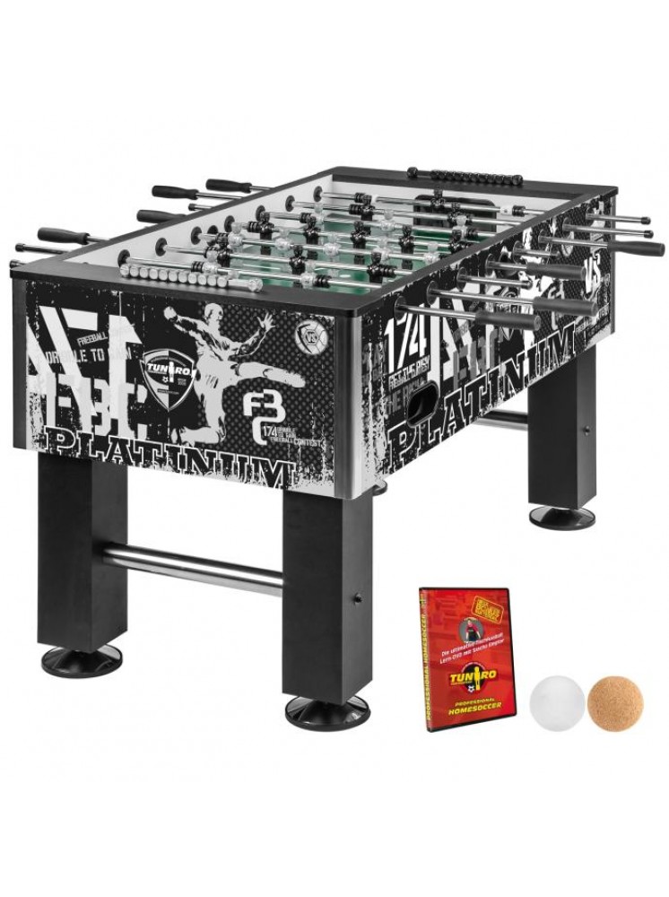 TUNIRO nogometni stol "PRO" / Izbor dekora: Crna, Bijela, Drvo, Platinum / Težina: cca. 110 kg / Dimenzije: 144 x 120 x 96 cm / Debljina stijenke: 35 mm / uklj. TUNIRO DVD i 2x lopte: Ø 35 mm