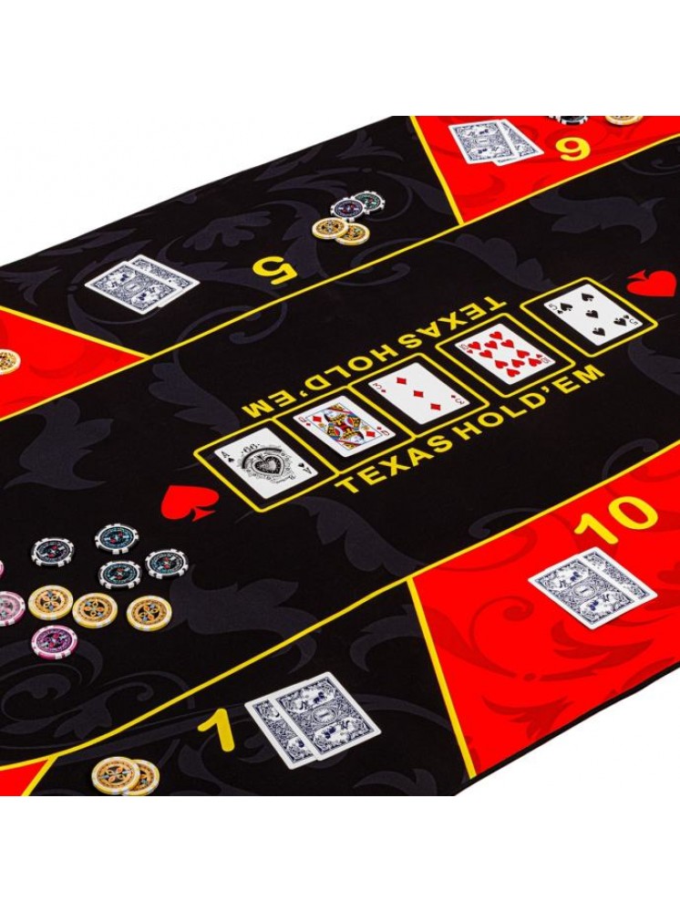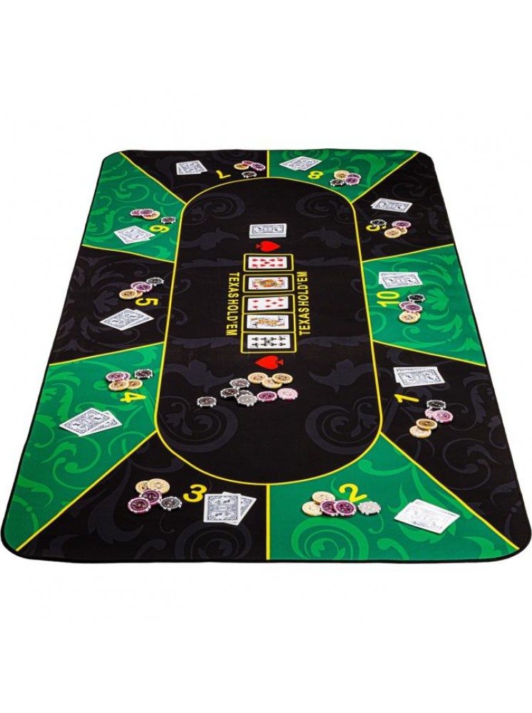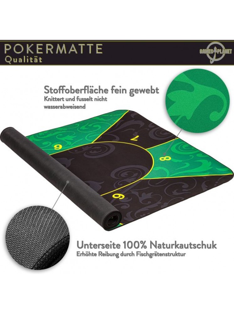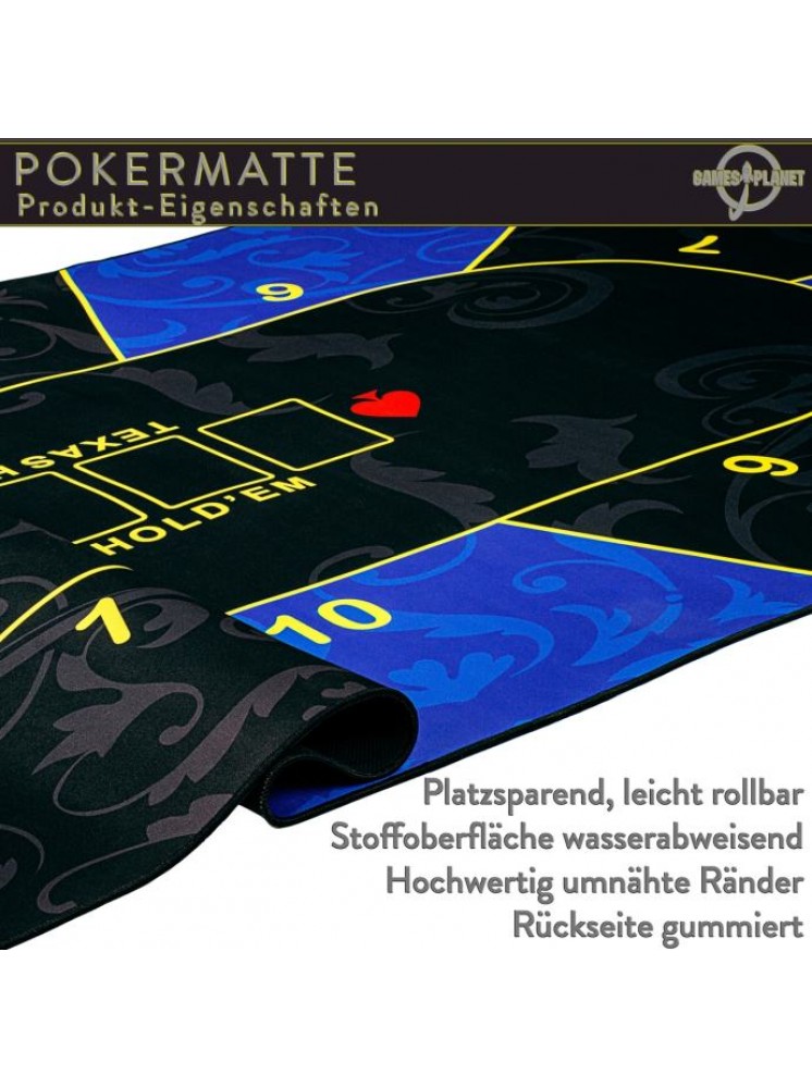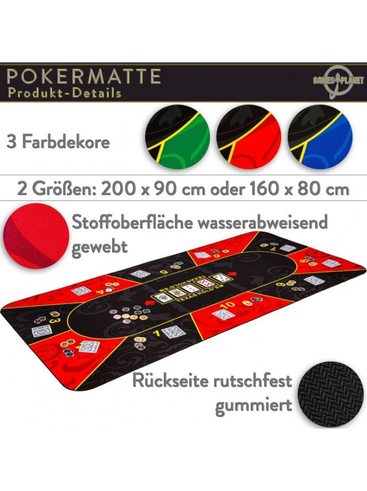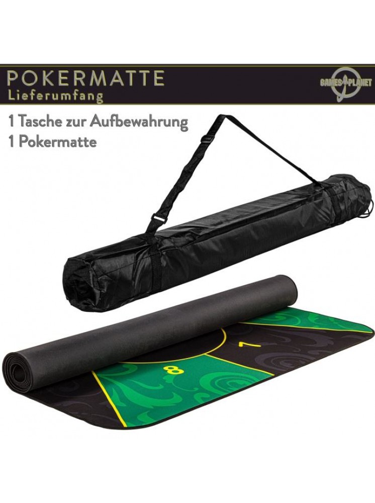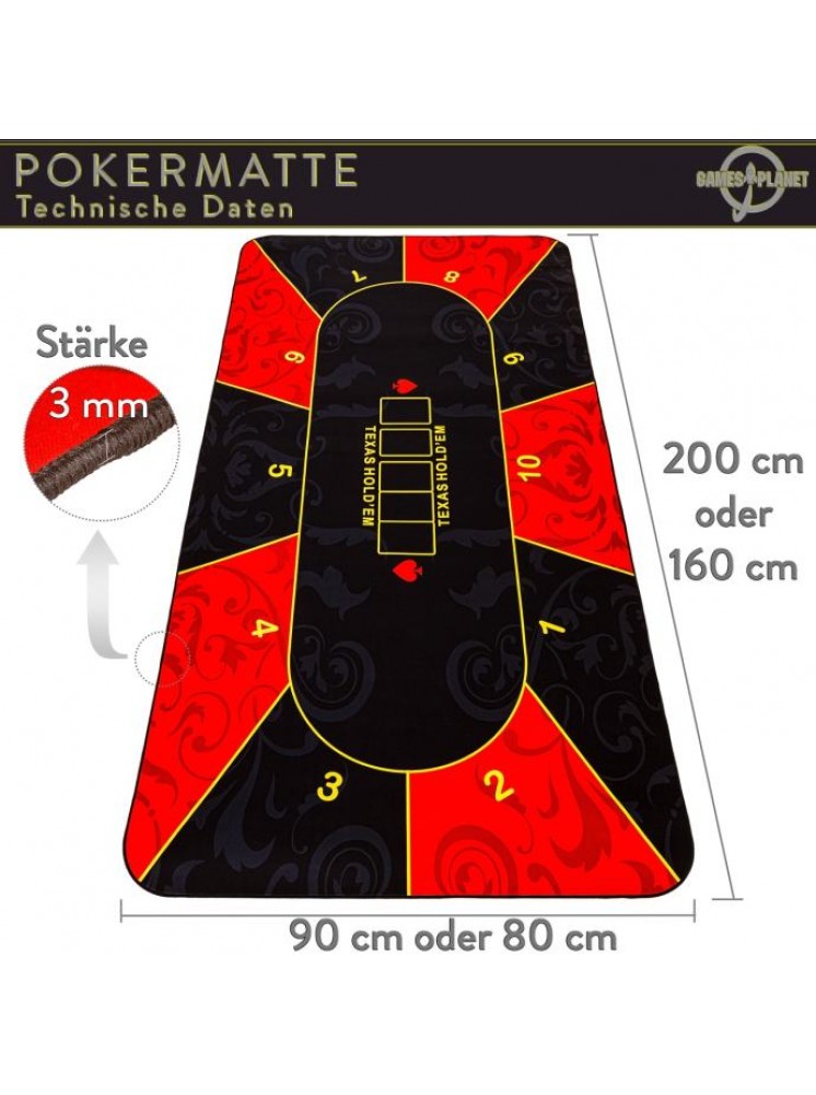 Podloga za poker GAMES PLANET XXL dimenzija 160 x 80 cm ili 200 x 90 cm (debljina 3 mm) prikladna je za do 10 igrača. Dostupan je u 3 atraktivna dekora: zeleno-crna / crveno-crna / plavo-crna. Prednja strana izrađena je od vodoodbojnog poliamida i ugodno je meka i glatka (slično podlozi za miša). Leđa su izrađena od protuklizne prirodne gume - gumeni premaz sprječava klizanje prostirke. Oslonac za poker može se smotati radi uštede prostora i može se lako ponijeti bilo gdje s torbom za nošenje uključenom u isporuku - tako da se svaki stol lako može pretvoriti u poker stol.