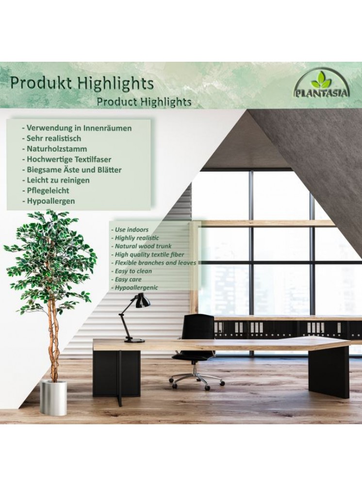 Umjetni fikus iz PLANTASIJE ima autentično ukorijenjeno pravo drveno deblo od palminog drva, a umjetno stablo ima i lišće od visokokvalitetnih tekstilnih vlakana. Naše umjetno drvce dostupno je u dvije veličine 160 cm sa 714 listova i 190 cm sa 1008 listova. Čvrsta cementna bazna posuda promjera 20 x H 15 cm pruža siguran oslonac za umjetnu biljku.