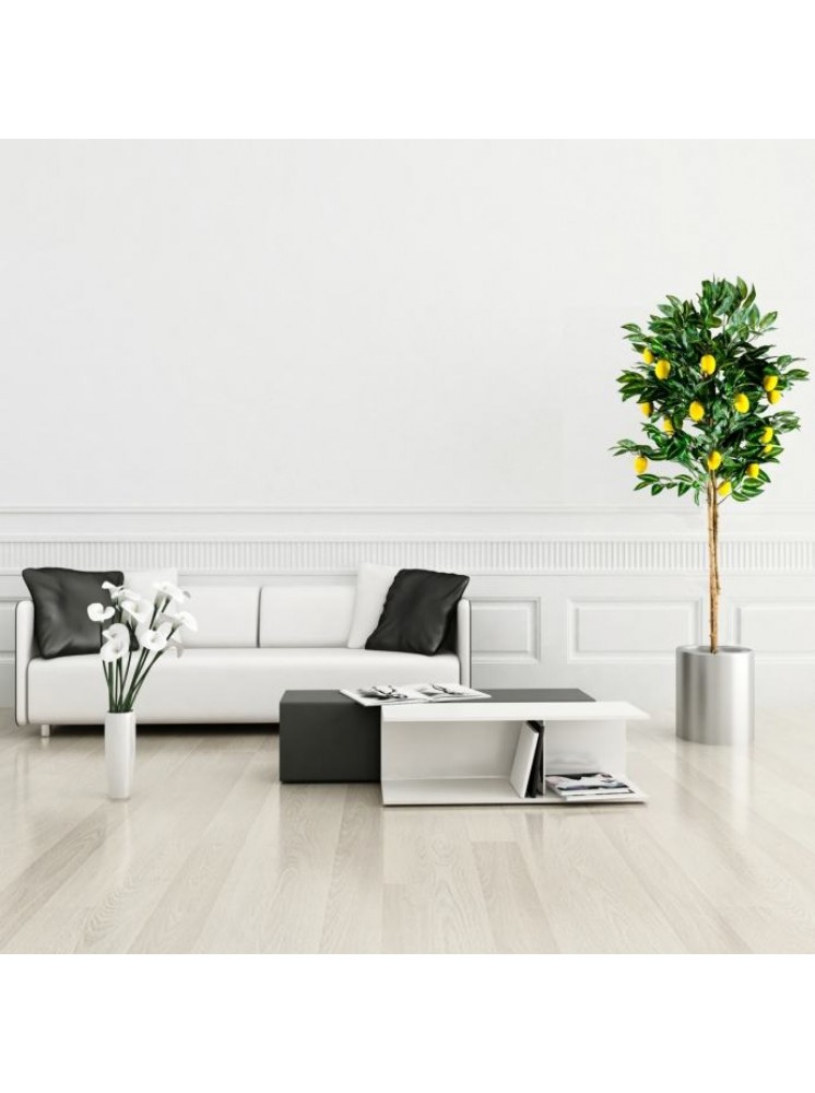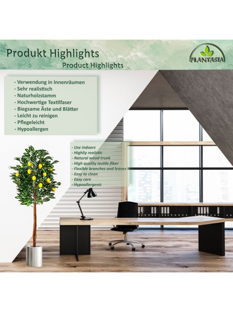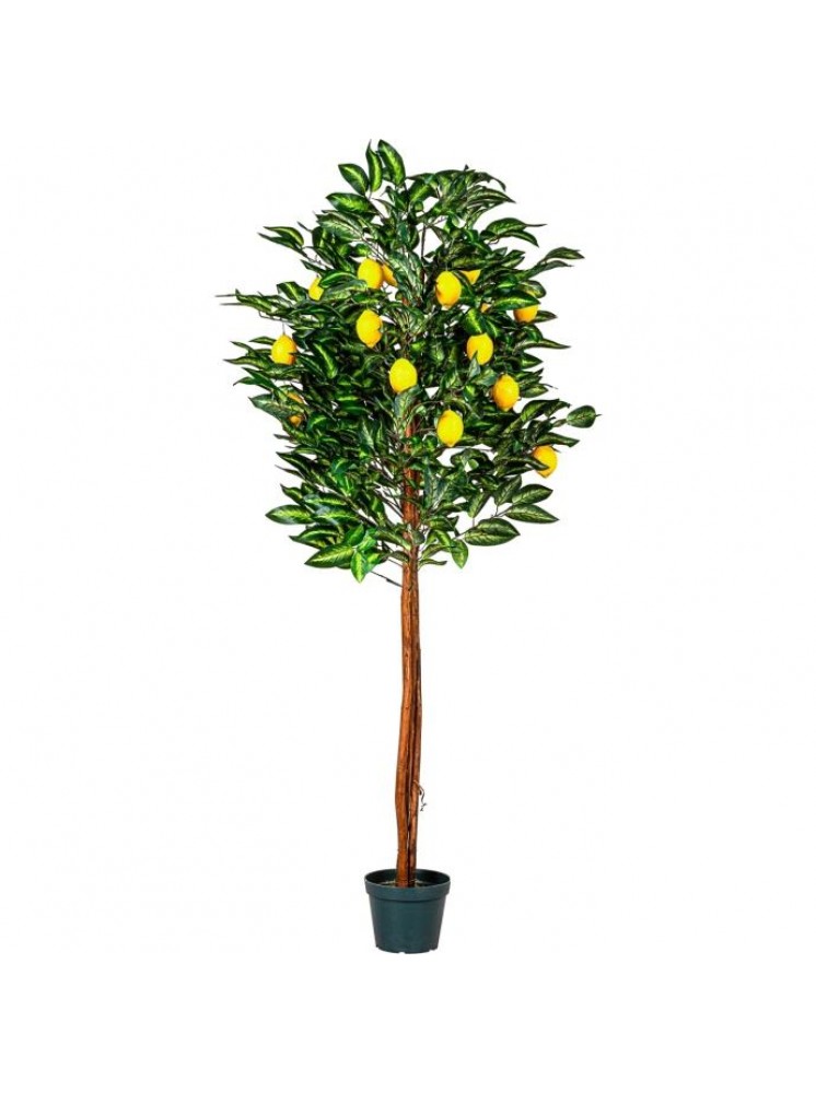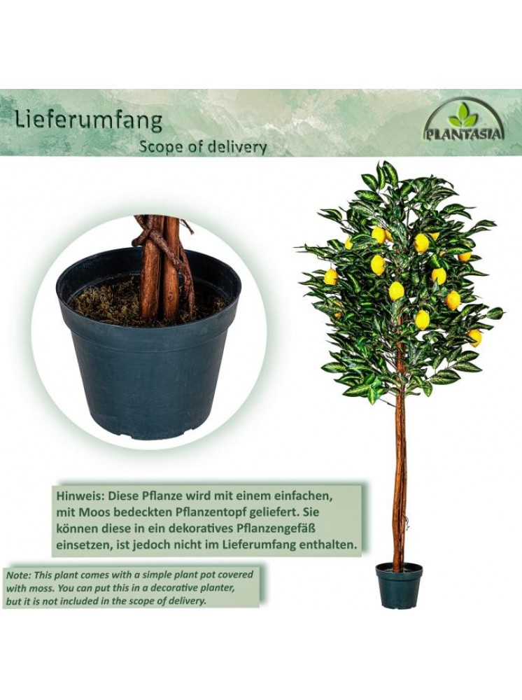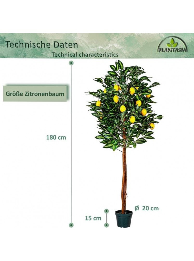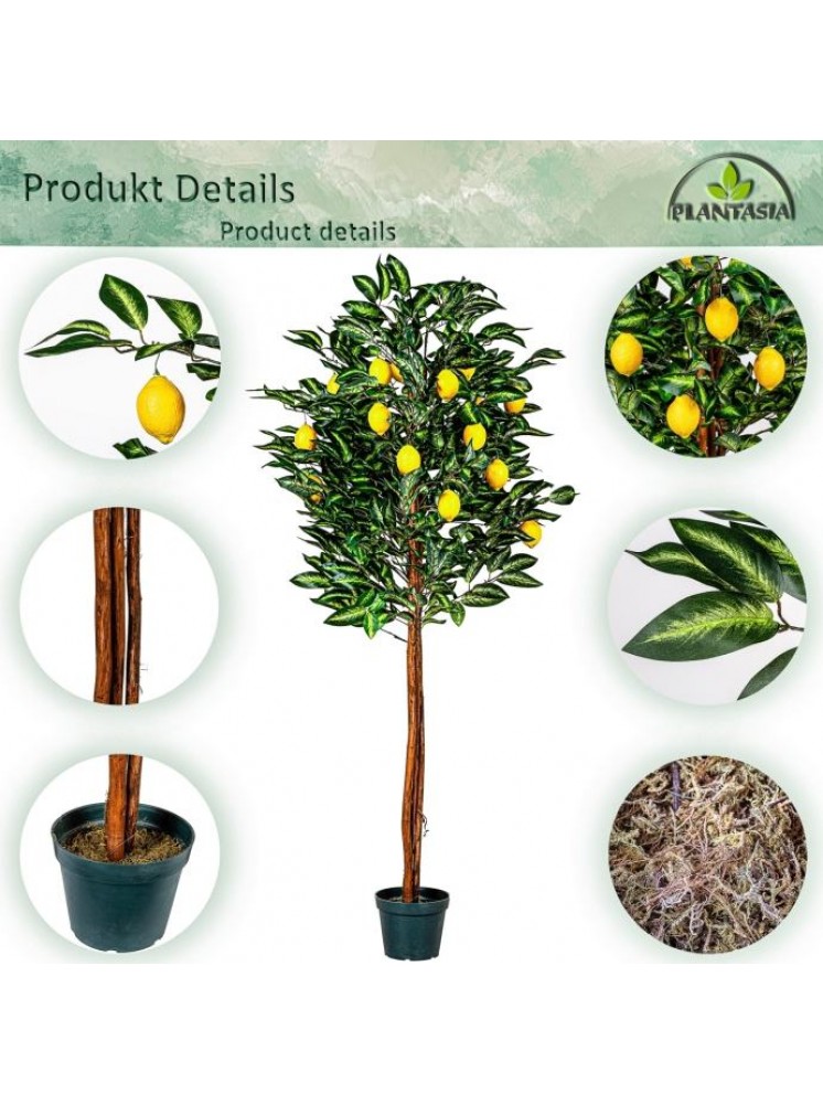 Umjetno stablo limuna iz PLANTASIJE visoko je 184 cm i ima autentično ukorijenjeno deblo prave palme.Voćka također ima 30 grana i 20 plodova. Naše umjetno drvce stoji u stabilnoj podlozi od cementnog lonca promjera 20 x H 15 cm.