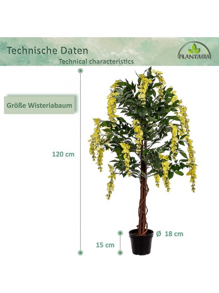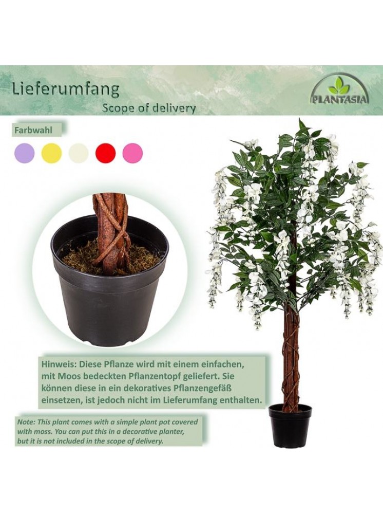 Umjetna glicinija iz PLANTASIJE ima autentično ukorijenjeno pravo drveno deblo od palminog drveta, a stablo glicinije također ima 756 listova i 24 cvjetne vitice. Stabilna cementna bazna posuda promjera 18 x H 17 cm pruža siguran oslonac za umjetnu biljku.